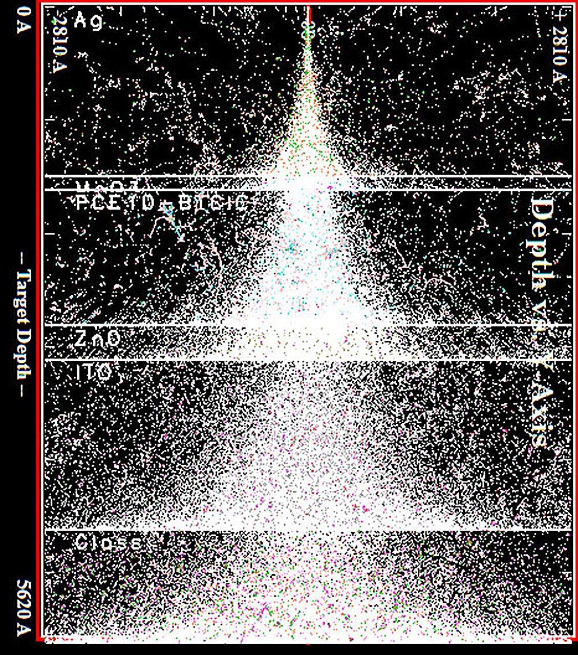 A simulation shows how deeply protons with higher energies of 100 kiloelectron-volt (keV) penetrate the solar cell. Solar wind protons can be accelerated to higher energies as they cross parts of the Earth’s magnetic field. At 100 keV, they can reach the glass backing of the solar cell. Credit: Yongxi Li, Optoelectronic Components and Materials Group, University of Michigan